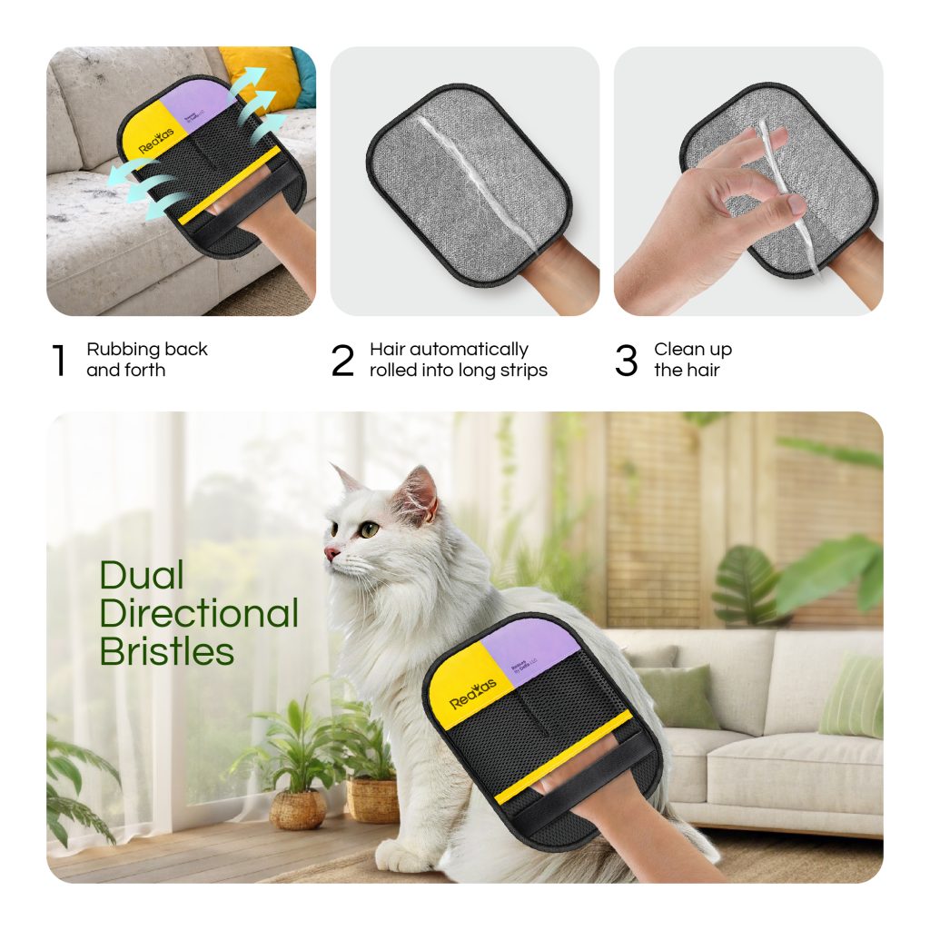 Reaxas gloves use electrostatic technology combined with dual-direction bristles to attract and trap pet hair, lint, and dust.