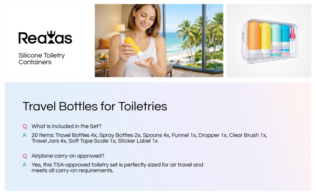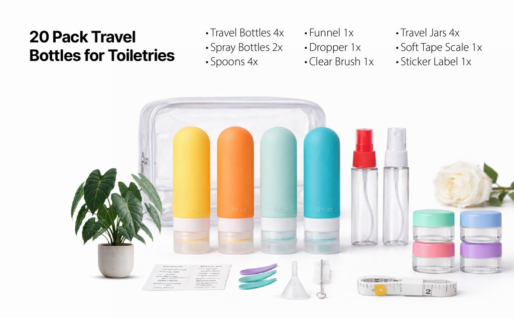 All containers meet TSA liquid size regulations, making this 20-piece toiletry set perfect for airline carry-on travel, weekend trips, and vacations.