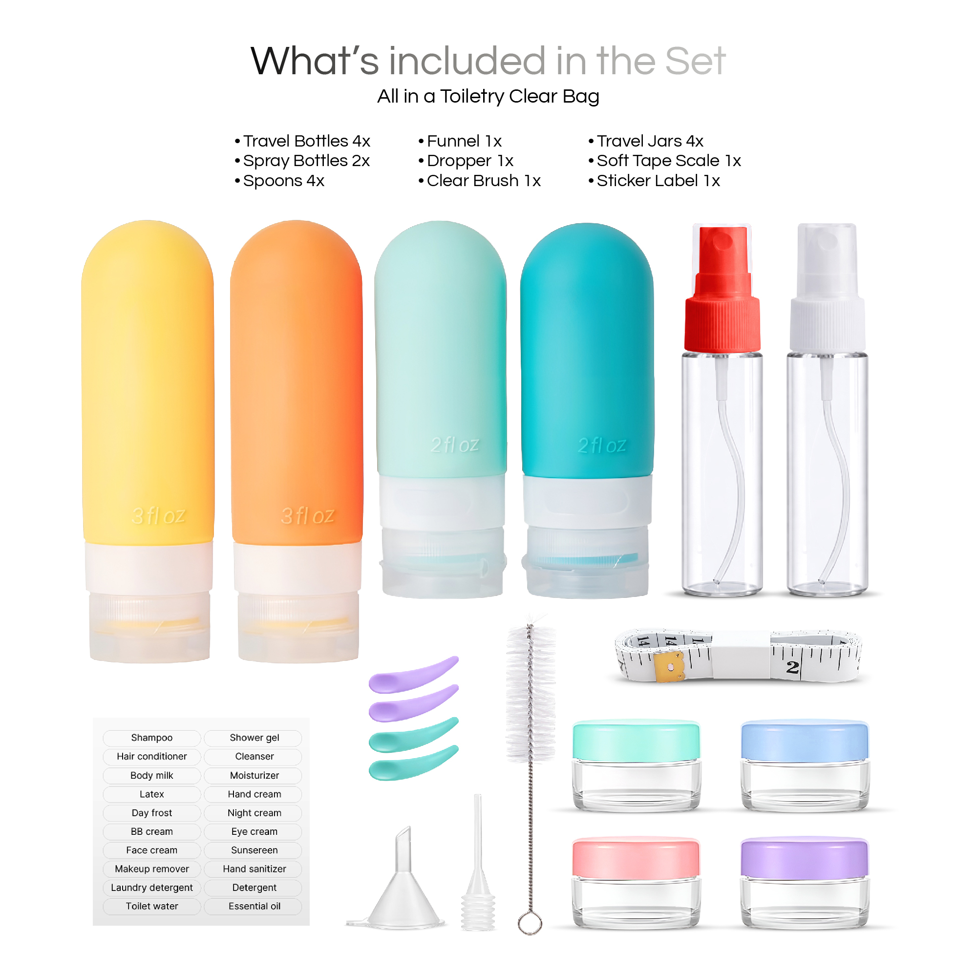 • Included components Bottles, Sprays, Jars, Soft Measure Scale, Funnel, Brush